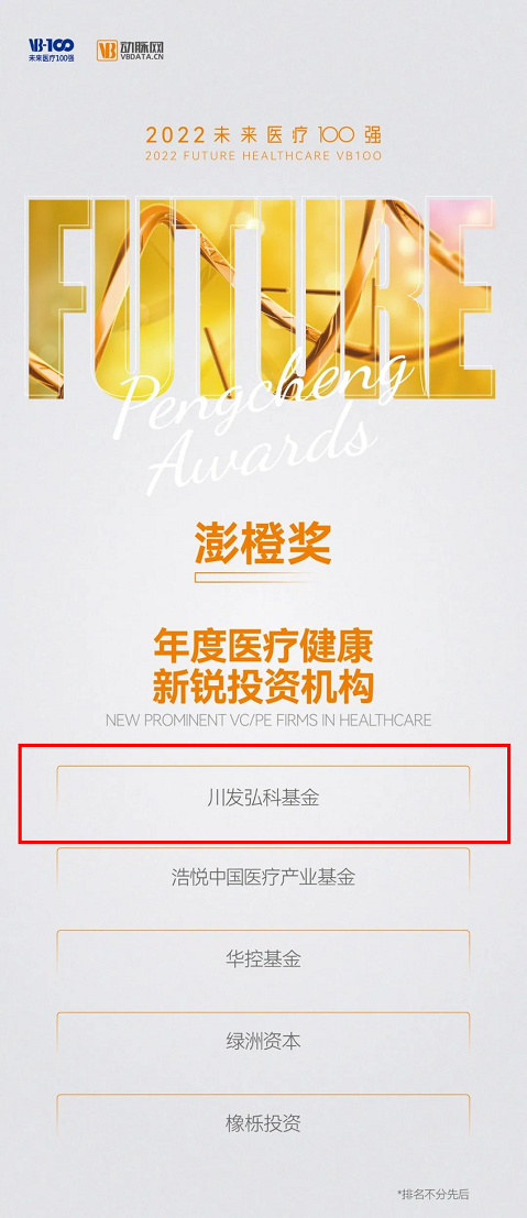 医产集团旗下四川发展弘科股权投资基金管理有限公司(简称弘科公司)在由VB100、动脉网、蛋壳研究院推出的“2022未来医疗100强”评选中,获评“澎橙奖·年度医疗健康新锐投资机构”。