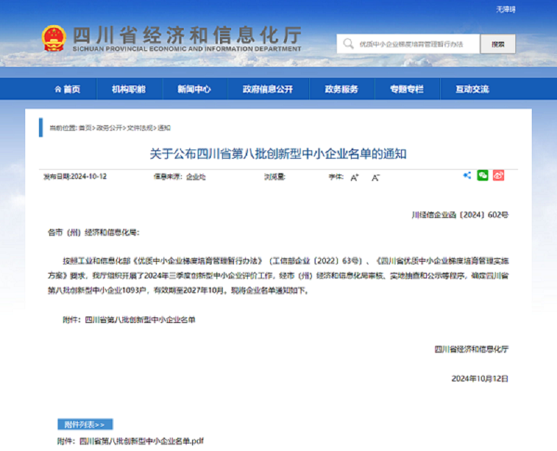 此次评价是按照工业和信息化部《优质中小企业梯度培育管理暂行办法》(工信部企业〔2022〕63号)、《四川省优质中小企业梯度培育管理实施方案》要求,由四川省经济和信息化厅组织开展的,有效期至2027年10月。根据《优质中小企业梯度培育管理暂行办法》,优质中小企业是指在产品、技术、管理、模式等方面创新能力强、专注细分市场、成长性好的中小企业,由创新型中小企业、专精特新中小企业和专精特新“小巨人”企业三个层次组成。其中,创新型中小企业具有较高专业化水平、较强创新能力和发展潜力,是优质中小企业的基础力量。创新型中小企业评价标准包括创新能力、成长性、专业化三类6个指标,满分100分,企业得分需达60分以上。
